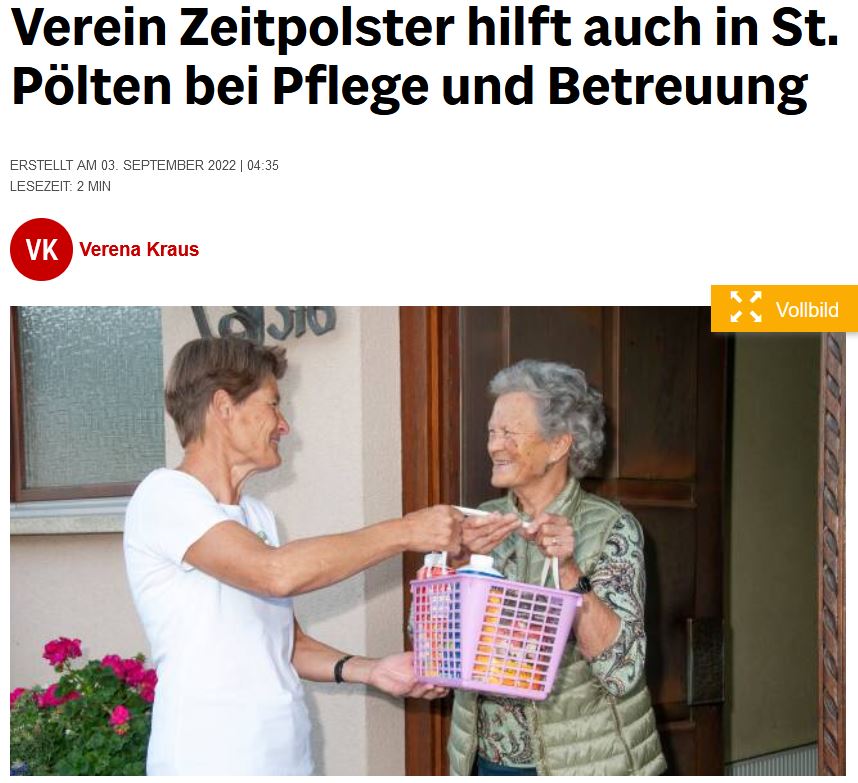 Lesen Sie den aktuellen Beitrag in der NÖN (Niederösterr. Nachrichten). Wir freuen uns sehr über den schönen und sehr informativen Bericht. Melden Sie sich gern jederzeit bei uns. Schreiben Sie uns an info@zeitpolster.at oder rufen Sie uns einfach an: 0664 8872 0770 – wir freuen uns auf Sie! Sparen Sie durch ihre Hilfe Stunden an – für den Tag, an dem Sie selbst einmal Hilfe brauchen sollten.